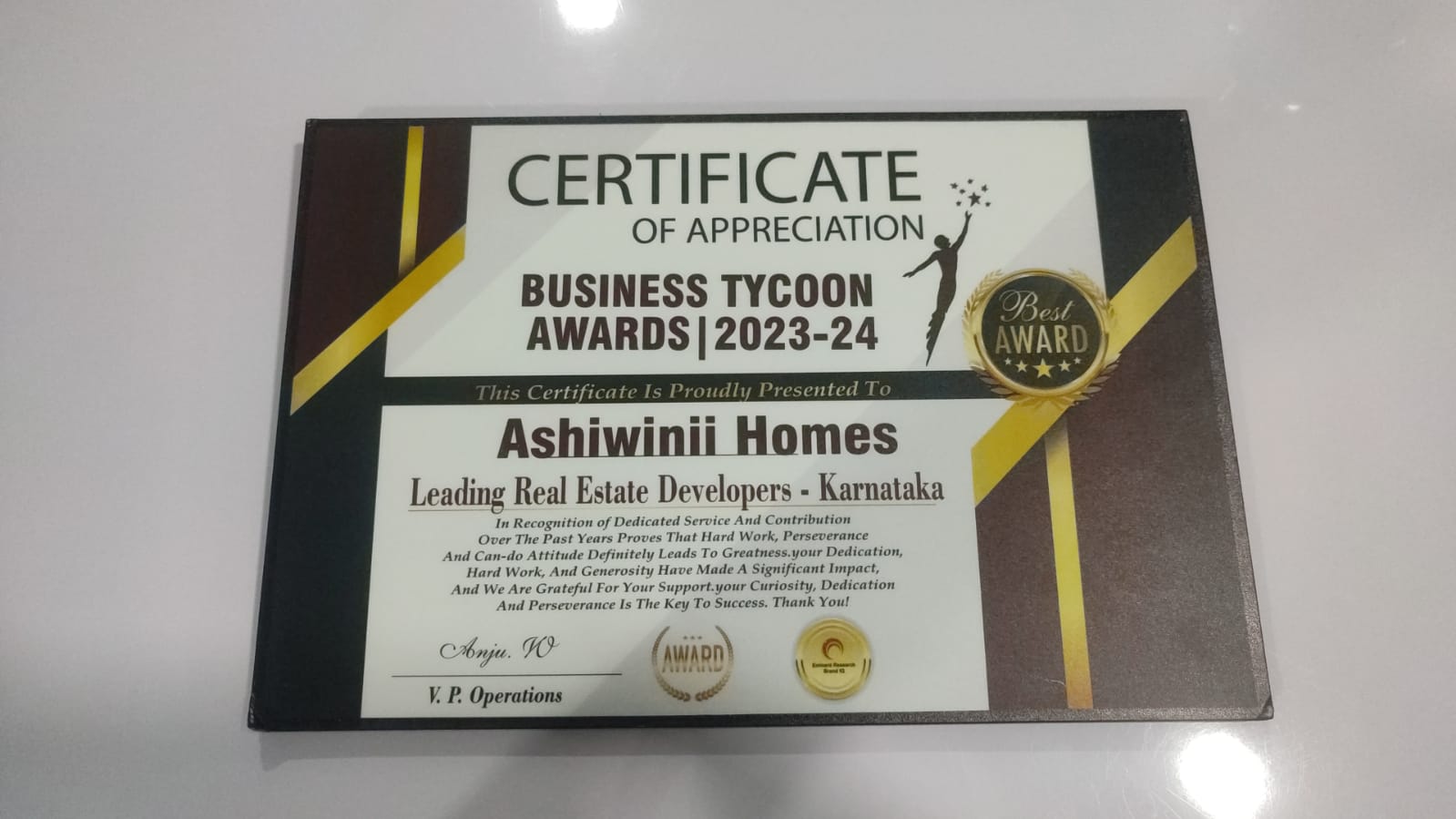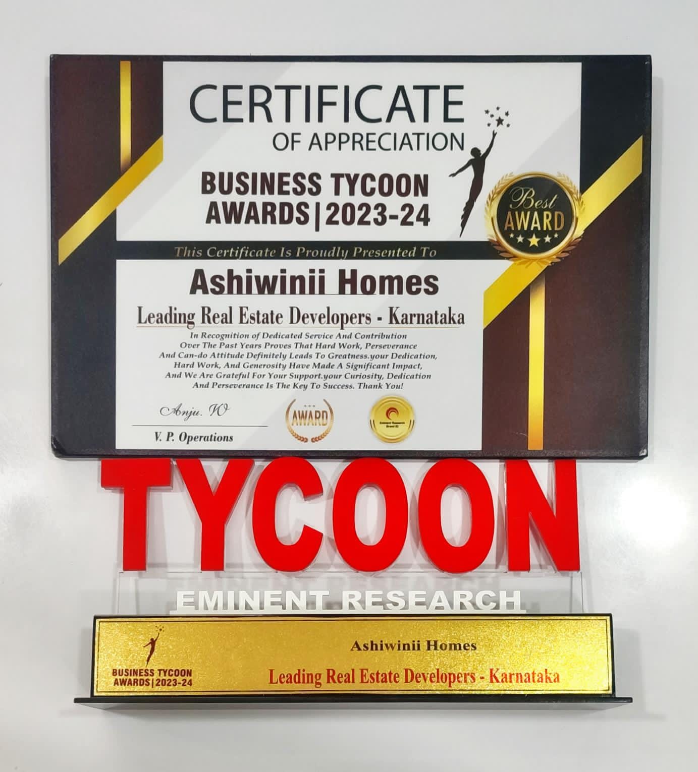 We are thrilled to announce that Ashwinii Homes has been proudly presented with the prestigious Certificate of Appreciation at the Business Tycoon Awards 2023-2024, recognizing us as a leading Real Estate Developer in Karnataka.
